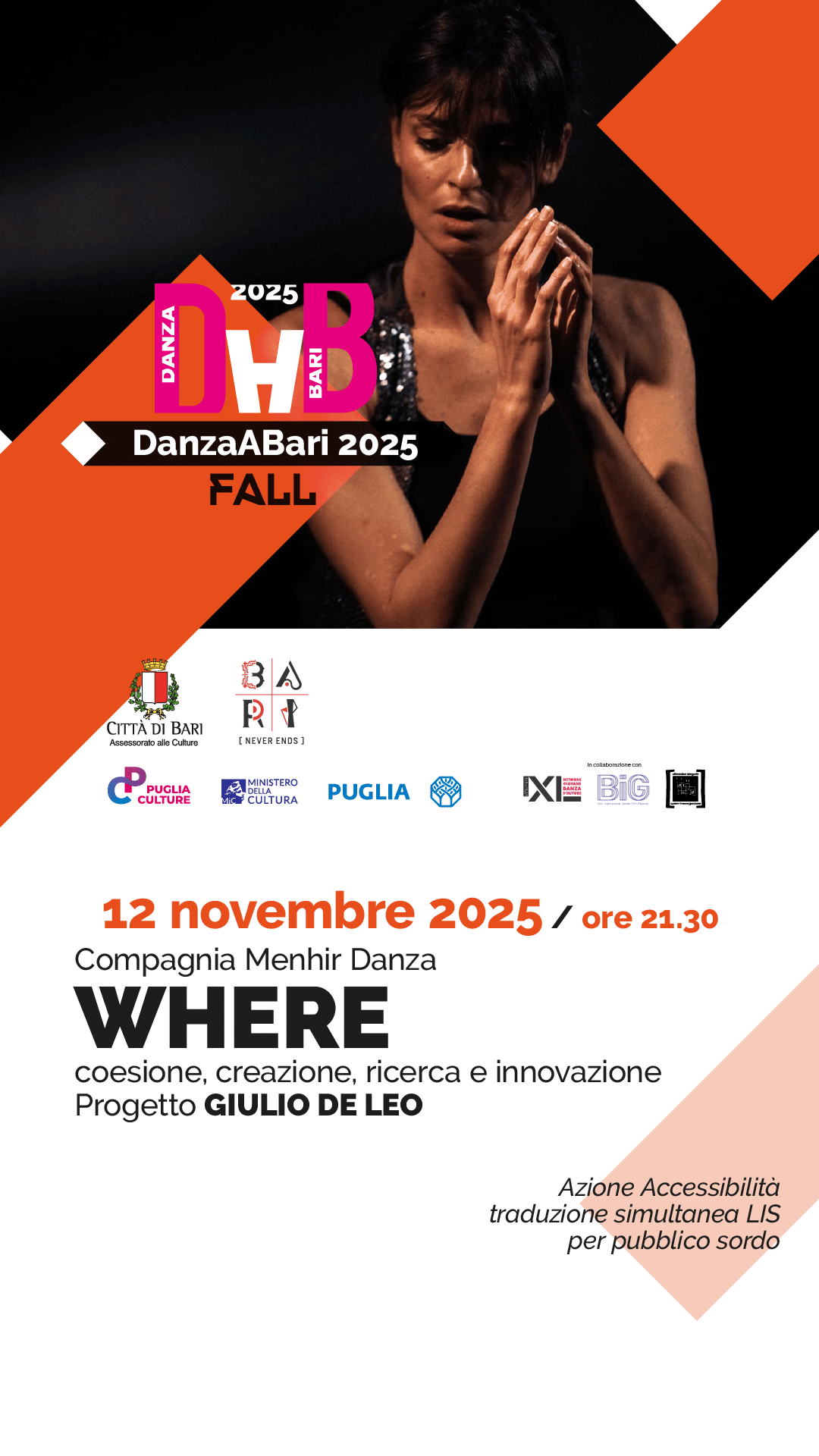 Si comunica che mercoledì 12 novembre 2025 alle ore 21:30 presso il Teatro Kismet di Bari si terrà l’ultimo appuntamento dell'edizione 2025 di DAB Festival – DanzaABari, rassegna dedicata alla danza contemporanea del Comune di Bari, realizzata in collaborazione con Puglia Culture e in sinergia con il Bari International Gender Festival. Lo spettacolo “Where” a cura della Compagnia Menhir Danza sarà accessibile in LIS.